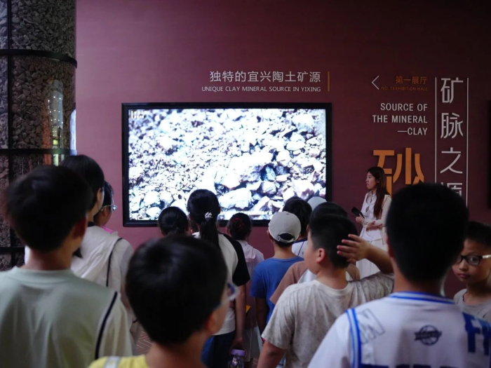 夏日炎炎,当蝉鸣遇见矿洞的回响,一场文化寻根之旅,在川埠社区暑托班精彩上演。步入矿源展示馆内,孩子们便被巨大的互动屏幕所吸引。光影流转间,从亿万年前紫砂泥的沉睡与苏醒,到先民偶然将其点化成器的惊喜,到历代匠人的薪火相传与创新突破,紫砂艺术的发展史变得生动可触。孩子们屏息凝神,在声画交织中,真切感受到了脚下这片土地所孕育的文化厚重与不凡。