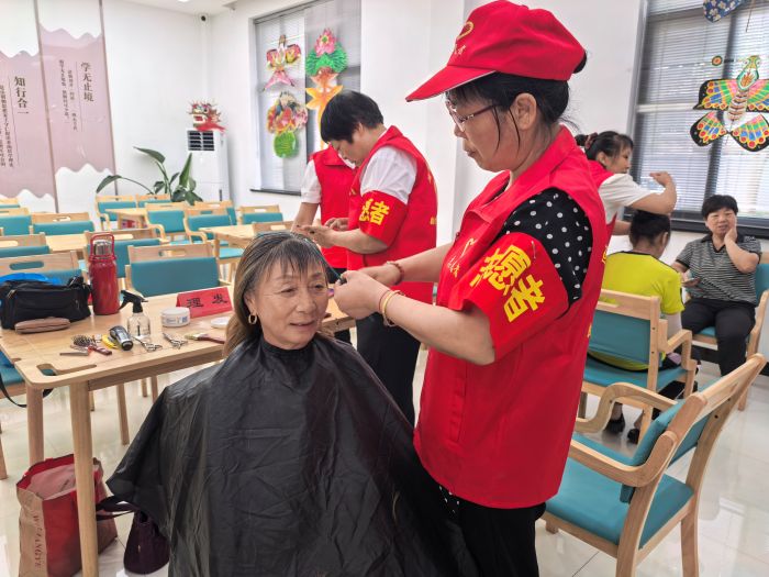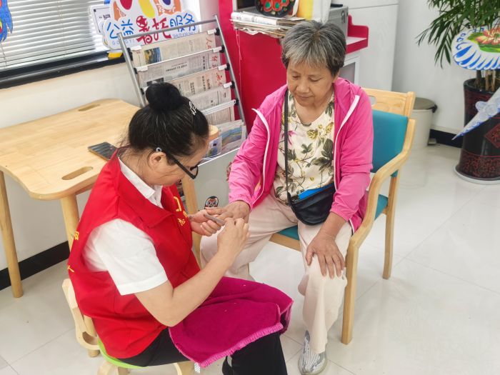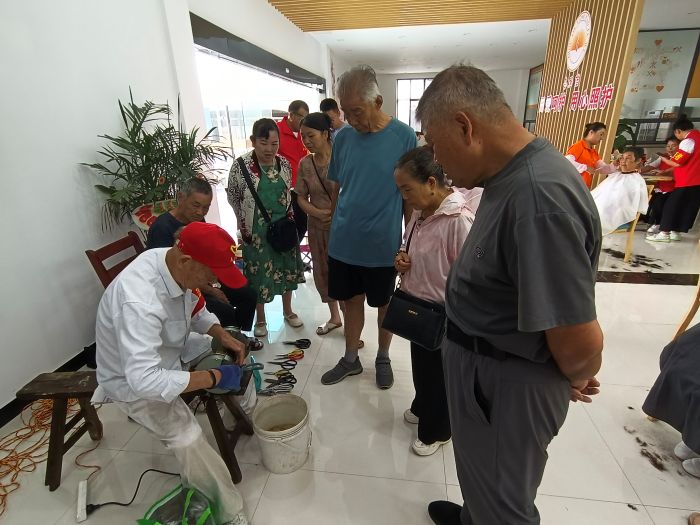 在社区党总支“红引竺鸢 筝心协力”项目的引领下,日间照料中心变身志愿服务大本营。理发、剪甲、缝纫、量血压、磨刀、按摩等服务点位有序排开。低龄老年志愿者们精神矍铄,各展所长:剪刀翻飞理出清爽发型,巧手轻点细致修剪指甲,针线穿梭修补衣物,血压计旁轻声叮嘱健康,磨刀石上重现菜刀锋利,轻锤捏压缓解身体疲乏。这些服务精准对接高龄老人需求,正是“红引竺鸢”项目“精准助老”理念的生动实践。