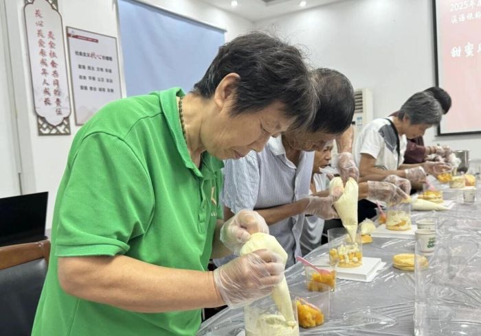 社区邀请的老年人相会在这,在专业烘焙师的指导下,亲手制作美味的奶油蛋糕,在指尖的忙碌与味蕾的享受中,感受社区大家庭的温暖。