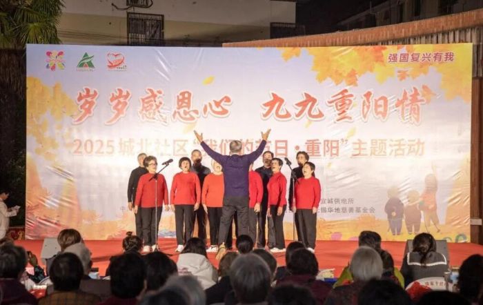 岁岁重阳,今又重阳。为弘扬中华民族敬老、爱老、助老的传统美德,城北社区于10月25日晚上在团氿花园北区广场举办“岁岁感恩心 九九重阳情”主题敬老活动,为辖区内80周岁的老年人送上定制蛋糕、手工寿面和重阳糕,并通过精彩的歌舞表演,让老人们在温馨氛围中度过一个难忘的节日。