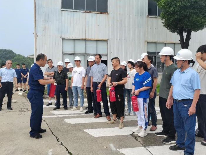 宣讲结束后于谢桥微密工业区进行消防演练,参演人员围绕着如何使用灭火器进行现场教育并实操。模拟突发火灾进行一次“实战”性的现场处置操作,企业观摩演练。并由环科园应急与生态管理局副局长谢叶华对本次演练进行点评指正。