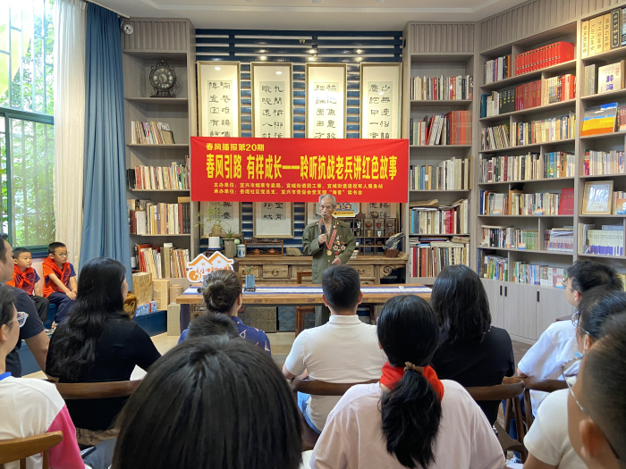 为牢记习近平总书记的谆谆教导,立志做有理想、敢担当、能吃苦、肯奋斗的新时代“有样青年”,进一步传承和发扬抗战老兵红色精神,7月26日上午,岳堤社区联合宜兴市烟草专卖局、宜城街道团工委、宜城街道退役军人服务站、宜兴市青促会党支部“海音”读书会,共同开展“春风引路,有样成长”聆听抗战老兵讲红色故事活动。宜兴市烟草专卖局办公室副主任童敏学、宜城街道退役军人服务站站长蒋彬彬、岳堤社区党总支书记周雪琴、宜城街道团工委朱苏青、宜兴市青促会党支部书记邵佳、“海音”读书会主理人周海英以及烟草局青年员工代表和社区青少年代表出席本次活动。