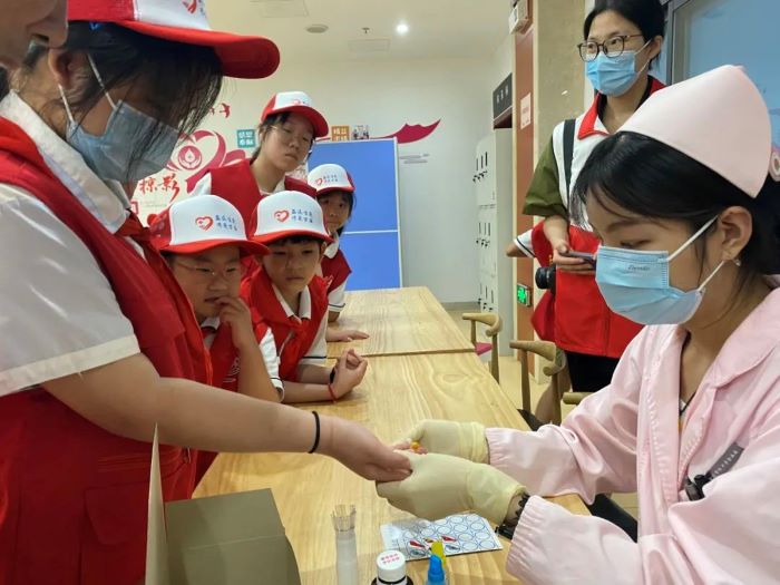 为向未成年人全方位科普无偿献血而举办的公益活动,旨在小朋友们心中种下无偿献血公益精神的种子,8月8日我社区组织社区24名青少年学生前往宜兴市红十字会血站开展“小血滴的旅程”暑期特别活动,在红十字志愿者的陪同下走进血站业务大楼,分组参观机采室、成分制备室、检验科及血库,全方位了解血站采供血的运作。