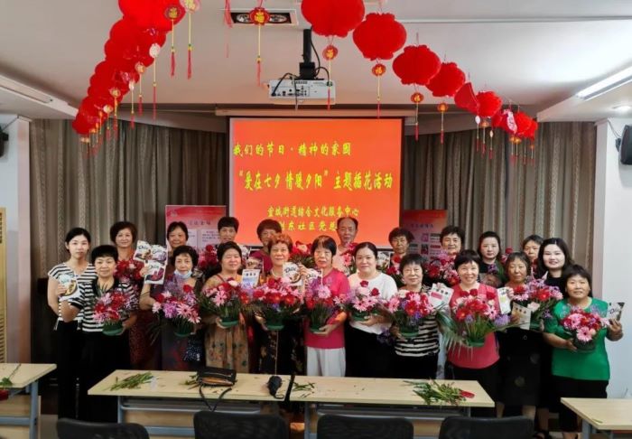 荆东社区开展“环球体育的节日·精神的家园——爱在七夕 情暖夕阳”主题插花活动