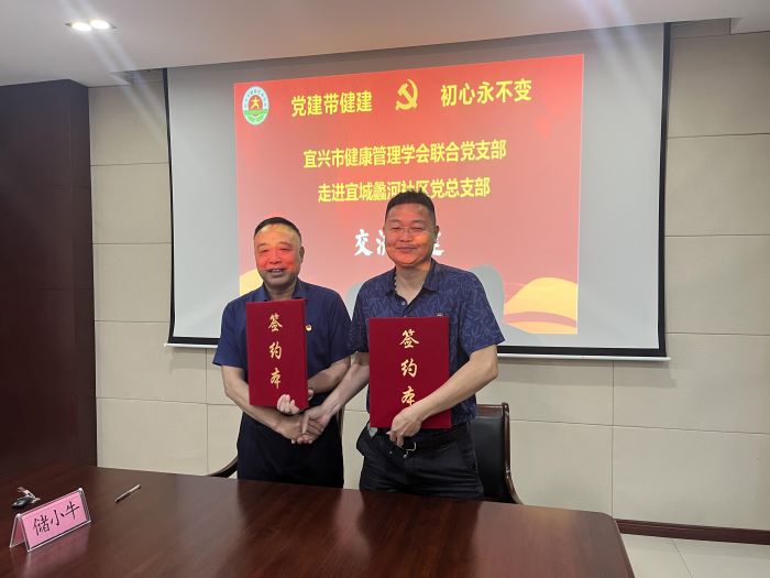 活动首先由中共宜城街道蠡河社区总支部邵胜君书记致欢迎词并介绍社区党总支部先进经验,中共宜兴市健康管理学会党支部陶卫强书记介绍学会党支部及学会概况。交流结束后,成功举行了结对共建签约仪式。