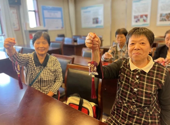活动现场,居民们细心地将吴茱萸灌入无纺布包,再放进香囊里,用线在香囊顶部系个结,一个个漂亮的茱萸香囊就做好了。大家开心地将香囊拿在手中合影留念。