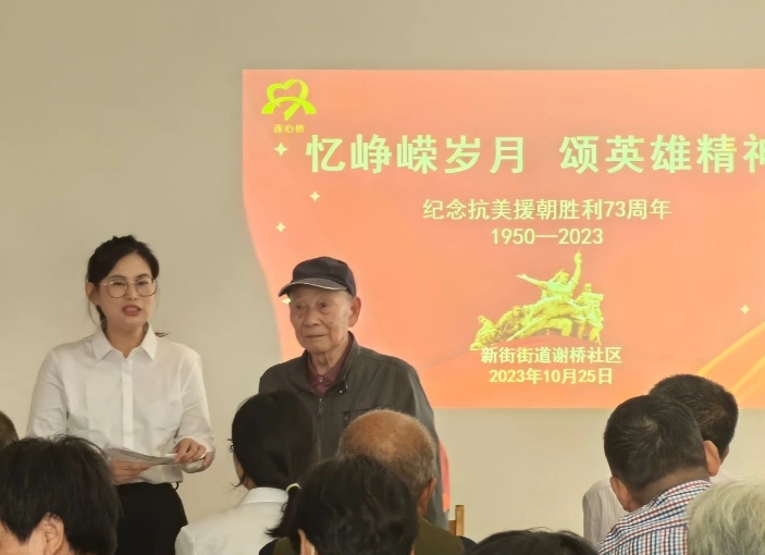为了纪念抗美援朝战争73周年,新街街道谢桥社区举办“忆峥嵘岁月·颂英雄精神”活动,邀请辖区抗美援朝老兵、退伍军人参加,共同致敬最可爱的人。