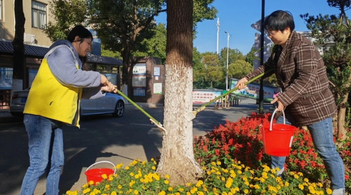 11月18日开始进行为期两周,谢桥社区在各小区开展“爱心护树·温暖冬天”活动,为小区1200多棵树木都涂上石灰“冬衣”。