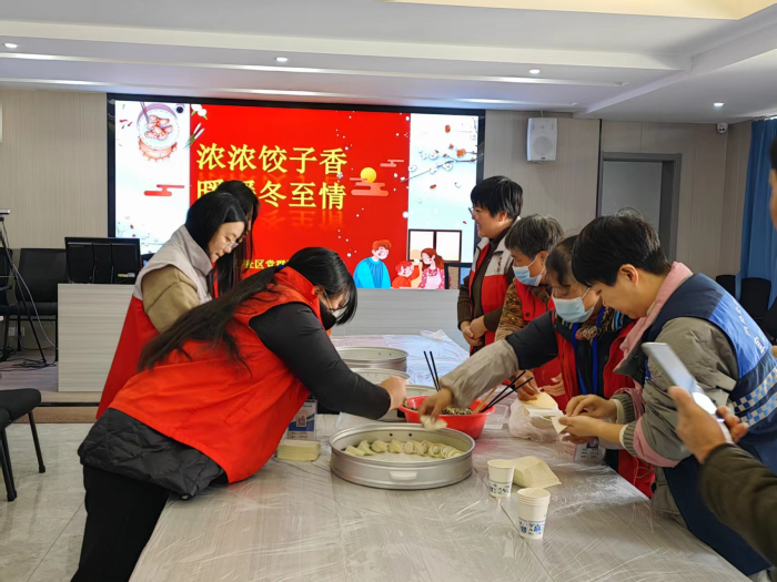 12月22日,在宜兴市万石镇万善社区党群服务中心党员活动室中,一群身着红马甲的志愿者,正围着条形桌子两边,他们正在灵巧地包着饺子,铝制蒸笼里已放满了刚包好的饺子,准备放到大型电饭锅上去蒸。这里是万石镇万善社区党支部、宜兴市顺飞老年人服务中心党支部、宜兴市社区便民服务中心万石片区牵手举行“浓浓饺子香,暖暖冬至情”党建联建活动的现场。