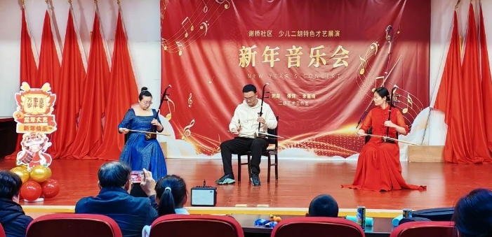 春节将至,为深入贯彻落实党的二十大精神,充分发挥文化引领的作用,弘扬中华传统文化、营造浓厚节日氛围,丰富节日期间群众文化生活,1月27日晚上,谢桥社区在社区综合文化服务中心三楼举办了一场“5G音乐庆新年·连心节目暖人心”新年音乐会,由刘路二胡工作室、环球体育有限环科园广电站协办。