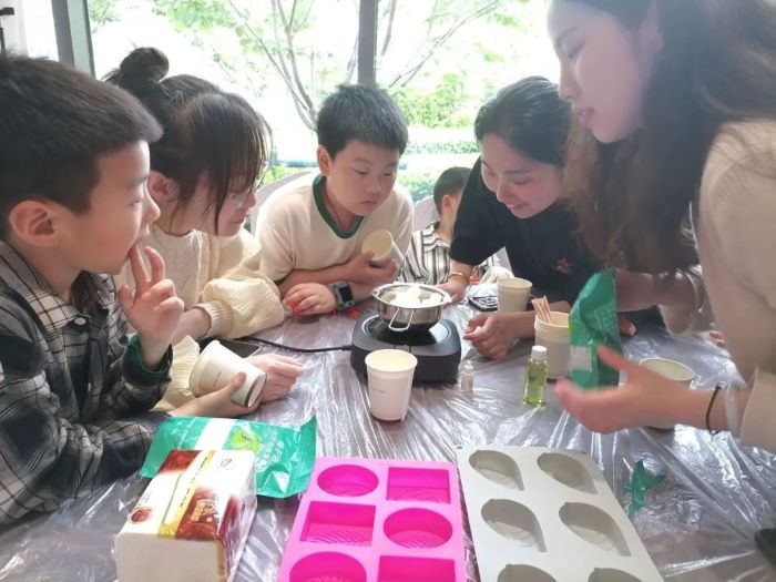 在介绍完之后,居民们行动起来,小朋友负责放花草、茶叶和调色,家长们负责融化皂基、放入模具,亲子间亲密协作,一起完成了他们的作品。