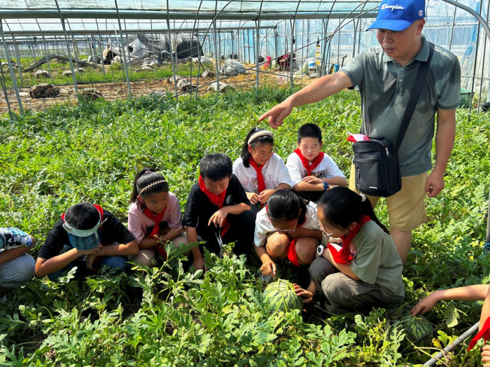 抵达后,洋溪村关工委副主任张志强热情地接待了所有人,并亲自带领学生们走进了一个个绿意盎然的蔬菜大棚。他详细介绍了多种蔬果品种,包括黄瓜、茄子、长豆、丝瓜、西瓜、桃子等,种类繁多,令人目不暇接。更让学生们兴奋的是,他们还有机会品尝了甘甜的西瓜,并亲手采摘了辣椒、茄子等蔬菜,尽管当天气温高企,但大家的热情丝毫未减,满心欢喜地沉浸在这场农业科技之旅中。