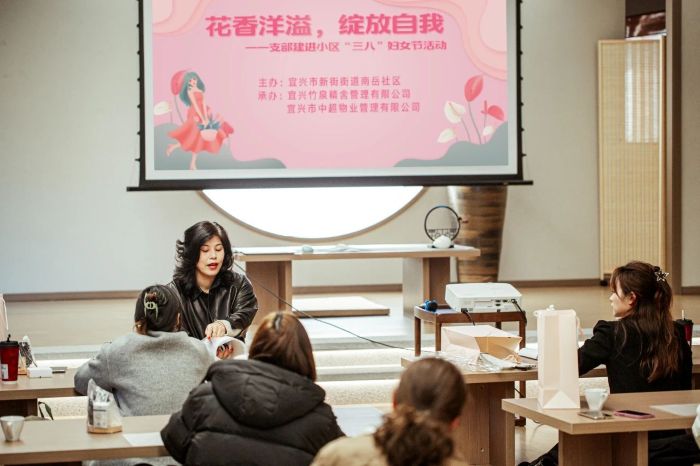 值此第115个“三八”国际妇女节来临之际,为丰富辖区女性文化生活,营造温馨和谐的节日氛围,3月6日下午,新街街道南岳社区联合宜兴竹泉精舍管理有限公司、宜兴市中超物业管理有限公司(熙岸阳光小区党支部)共同开展“花香洋溢,绽放自我”主题花艺活动。