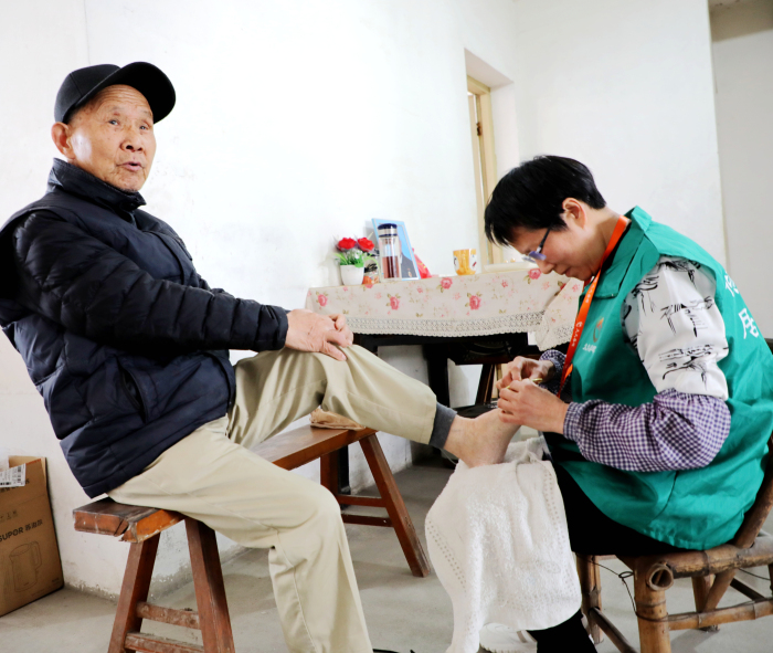 4月13日正午,新街街道西花园一村6幢206室飘来轻快的剪刀声。阳光透过纱窗织成金色的网,将正在半蹲服务的黄宝芬与86岁的陈锡清老人笼罩其中。这位曾荣获国家农业部渔业技术先进个人的老专家,此刻正舒展着布满皱纹的笑脸,任由黄宝芬细致修剪指甲——这样的温情画面,在黄宝芬的服务日常里已是寻常风景。