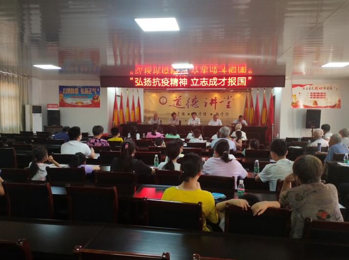 在主席台就坐有镇关工委领导徐志良、吴听南,村关工委领导丁再明、辅导员张富根,做讲座报告的是退休教师张新元。张老师在讲座中讲述了我国人民在党和政府的英明领导下,全国人民奋起抗战,历时三个月时间抗击疫情取得了阶段性胜利的经过,例举了诸多在抗疫第一线白衣天使、社区工作者、公安干警、人民解放军、基层干部的英勇壮举,他要求青少年们要弘扬抗疫精神,立志成才报国,张老师生动形象的讲话博得了全场阵阵掌声。讲座结束前,镇领导徐志良做了重要讲话并安排青少年们分组进行讨论,讨论时,气氛十分热烈,青少年们纷纷表示一定弘扬英雄们的精神,好好学习,丰富知识,健康成长,成才报国,把振兴中华、傲立东方的重任担上肩、勇向前。