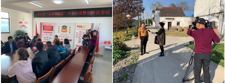 会议结束后栏目组在村工作人员的带领下入村进一步拍摄并查看河道管理 情况,并在现场采访佘圩村党总支书记薛锡群,薛书记说:“佘圩村将“有事好商量”协商议事室与网格化管理结合统一,将协商议事室的河道整治协商意见纳入网格化实行,通过网格化河道精细管理,将9条河道划分归到每个网格内,通过网格定责,强化河道管护,实行河道精细化管理,确保河道日常巡查、保洁、疏浚等工作落到实处。并在每周一网格例会后,每位三级网格长带领网格小组前往各自河道进行查看,对河道内的垃圾,浮游生物水草进行清理,确保河道长效管理保持河面干净,做到周周检查,周周清理。河道长效化管理中我村除了人工治理以外还善于利用自然界生物治理河道,由于水动力不足,水质容易富营养化,浮游生物以及水草极容易疯长,为了缓解人工治理河道的压力,村级投资4万多资金购买数万尾草鱼鱼苗,利用草鱼以水中浮游生物以及水草为食的食性,进一步净化河道内的水质,对于养殖的鱼类,我村也加大力度进行保护,明令禁止进行各种捕捞行为,村级每月通过网格化管理,对河道内渔网、地笼进行清除,大力整治打击电鱼现象,日常巡逻对钓鱼行为进行制止。河道治理不能违背自然规律,我村将9条河道与南溪河相通,通过自身水循环进行河道自清理,通过三角河道治理体系筑牢河道整洁体系。”