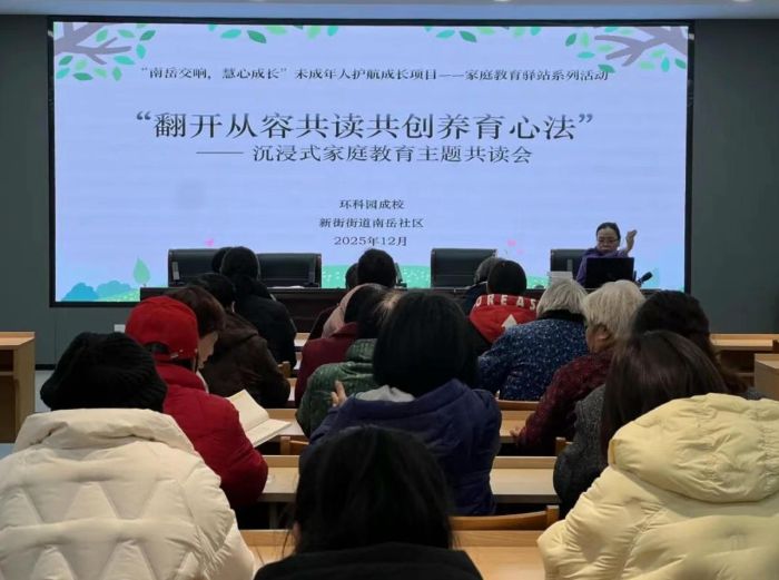 为深入贯彻《中华人民共和国家庭教育促进法》,引导全社会注重家庭、家教、家风,筑牢家庭幸福根基、涵养和谐社会新风,12月23日下午,南岳社区携手环科园成校,成功举办“翻开从容:共读共创养育心法”沉浸式家庭教育主题共读会。30余名家长踊跃参与,共读《做从容的父母》,在互动中纾解育儿焦虑,习得科学养育良方。