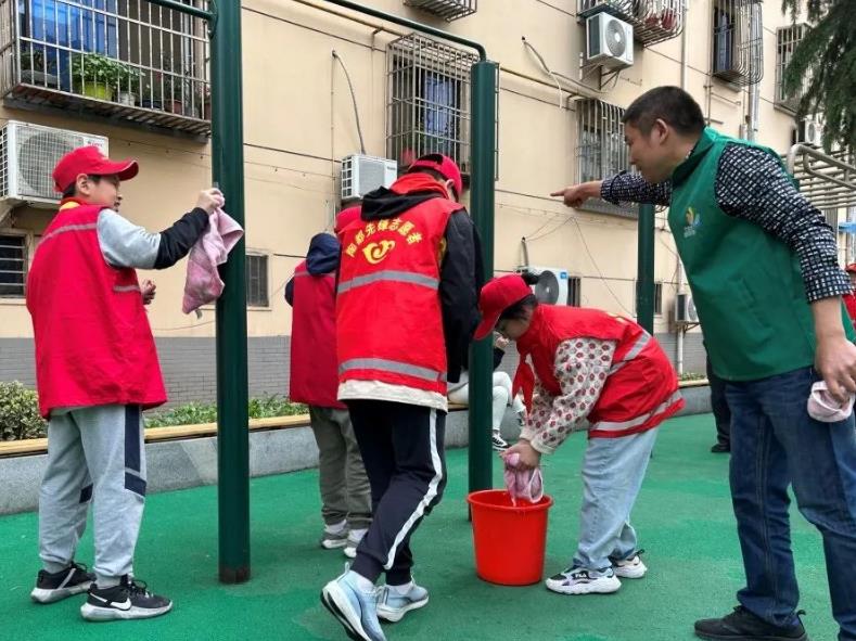 活动中,一组小小志愿者们身披红马甲、头戴志愿帽,手中拿着垃圾夹、笤帚、抹布等,穿梭在小区的各个角落,个个干得热火朝天!有的打扫楼梯和走道、有的捡拾绿化带里的垃圾、有的擦拭健身器材的灰尘……社区居民看到孩子们辛勤劳动的场景,不约而同地竖起大拇指说:“这些孩子真棒啊!”