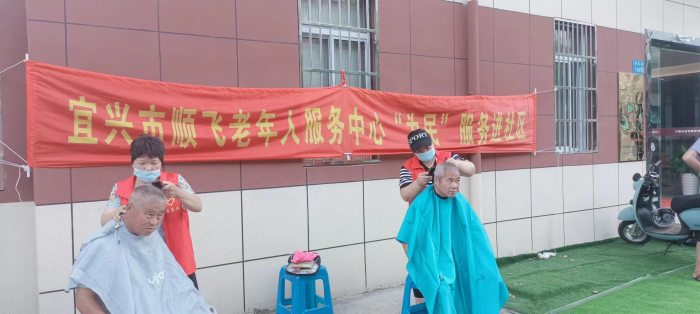 宜兴市顺飞老年人服务中心党支部的党员志愿者为参加义诊的居民提供免费理发、推拿等服务,并听取参加居家养老援助服务公益项目对象的意见建议。