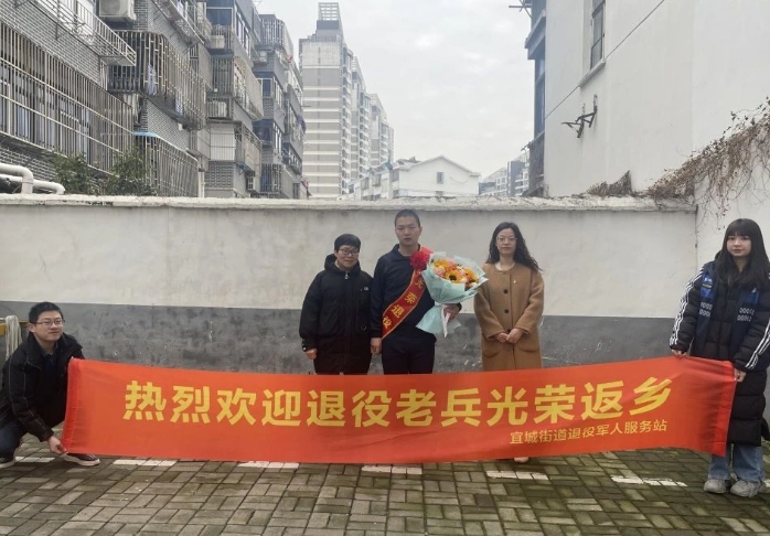 昨日建功军营,今朝荣归故里;去时红花相送,归时夹道相迎。为营造全社会关心关爱退役军人的浓厚氛围,3月1日,新华社区联合宜城街道退役军人服务站开展退役军人返乡迎接活动,联合宜城街道退役军人服务站军属们一起热情迎接退役军人光荣返乡,着力提升退役军人的获得感、归属感、幸福感。