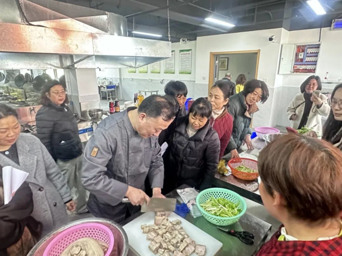 首期课程特邀宜城街道老年大学烹饪课戴浩老师授课。他结合家常需求,精心设计“茨菇红烧肉”与“芹菜拌干丝”两道特色菜品教学。从选材窍门、刀工技巧到火候把控,戴师傅步步拆解、倾囊相授,更以幽默的讲解化解操作难点。