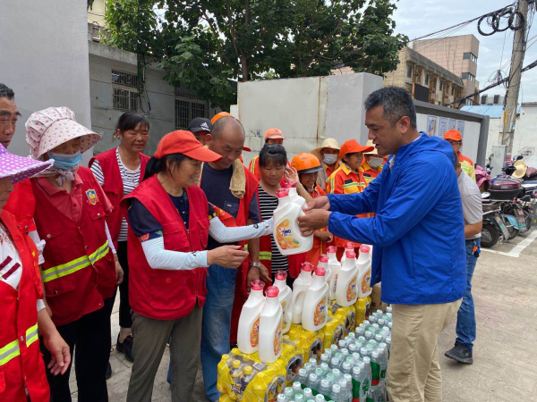 为了表达对在炎炎夏日辛苦工作的环卫工作者的感谢,8月14日上午,南京市栖霞区合班村社区党委将防暑用品和食品送到了在一线工作的环卫工作者手中。