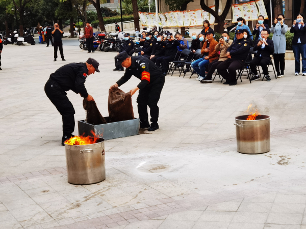 在119消防日来临之际,南京市栖霞区迈皋桥街道华电社区中电党支部与中电三四五期物业联合在中电五期广场共同举办了“2020年度119消防演练活动”,社区党委副书记倪义明、栖霞消防大队等有关领导出席,小区部分党员和业主现场观摩了活动。 活动开始,栖霞消防大队的刘旸同志,首先讲解了家庭消防知识,随后,中电物业保安队进行了队列训练、油盆灭火、湿毛毯灭火、楼道救人、警备车实际出水等实操活动。(吴莉娟)