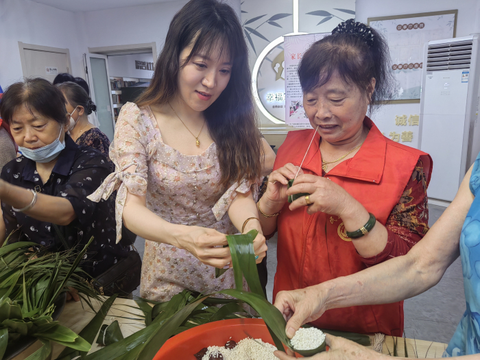 粽子是中国传统节庆食物之一,端午食粽的风俗已经深入人心。活动现场,积善社区社工与志愿服务队志愿者一道体验了包粽子的全过程,裹叶子、填糯米、缠线……年轻社工、志愿者体会到自己亲手包粽子的乐趣,老年志愿者锻炼了动手能力。