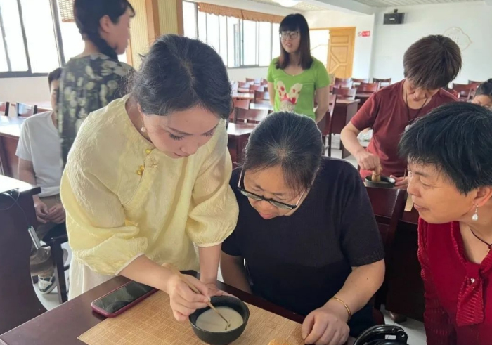 在实践体验环节,社区活动室茶香四溢,气氛热烈。洁白的茶盏、古朴的茶筅整齐摆放,女性朋友们围坐桌前,兴致勃勃地动手实践。她们专注地称量茶粉、缓缓注水,手持茶筅轻盈旋转、有节奏地击拂茶汤。尽管初次尝试手法略显生疏,但随着老师的耐心指导,渐渐掌握技巧。不一会儿,细腻绵密的茶沫在盏中升腾,宛如堆雪。更有心灵手巧的参与者,尝试用茶粉勾勒出竹子等图案,在茶盏中绘就一幅幅灵动的“水墨画卷”。