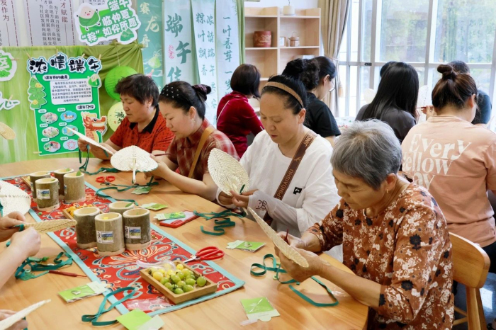 活动伊始,专业老师为大家带来了一场生动有趣的端午知识讲解。从端午节的起源、传说,到各地的风俗习惯 ,老师绘声绘色的讲述,让居民们仿佛穿越时空,领略到了端午节深厚的历史文化底蕴 。现场居民们全神贯注地聆听,积极与老师互动,踊跃回答问题 ,不仅学到了知识,还收获了精美的小礼品 。通过这次知识讲解,大家对端午节有了更全面、更深入的认识,也更加坚定了传承和弘扬传统文化的决心 。在手工制作环节,居民们一起动手制作粽子手工钥匙串和国风蒲扇。 制作粽子手工钥匙串时,五颜六色的彩绳在大家的手中上下翻飞,搭配铃铛挂饰,小巧精致又寓意安康!制作国风蒲扇的过程同样充满乐趣 ,一把把普通的蒲扇任你发挥,画龙舟竞渡、绘水墨粽子或写下端午祝福,摇出专属夏日的清凉,在大家的精心创作下,变成了独一无二的艺术品 。