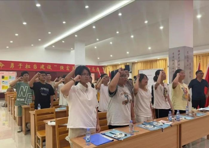 全体师生肃穆而立,面向国旗,高举右手,铿锵有力地在国旗下庄严宣誓,以昂扬的姿态展现了青少年们弘扬奋斗精神的决心。