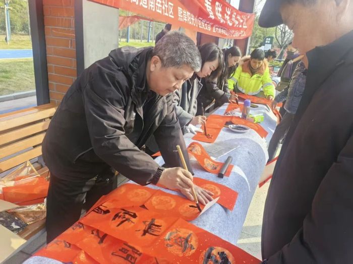 新春将至,年味渐浓。为深入传承中华优秀传统文化,丰富社区居民的精神文化生活,营造欢乐祥和的节日氛围,1月28日下午,新街街道南岳社区联合熙岸阳光小区党支部、宜兴高等职业技术学校、宜兴爱心一家义工社,在西花园街心公园举办“挥墨飘香承传统 春联送福进社区”主题活动。活动邀请多名书法爱好者现场挥毫,为辖区居民送上满载新春期许的文化厚礼。