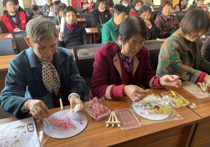 在活动现场中妇女朋友们互相观摩,气氛融洽。在这场手工艺术里,收获的不仅是这把专属的干花团扇,更是增强妇女同志们的创作能力,激发其手工制作的兴趣爱好,让其收获一份心静。