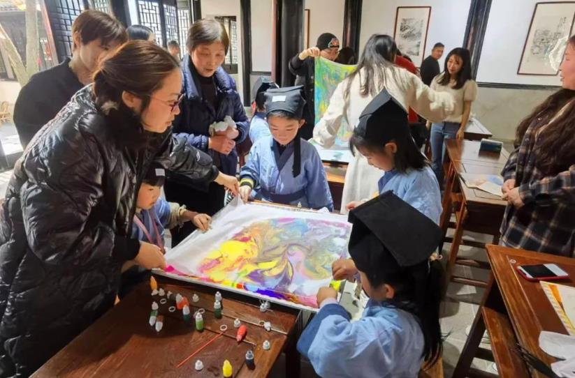 老师先向大家介绍了制作转印丝巾所需要的工具,并展示了如何使用这些工具完成一方转印丝巾。“将画液倒入容器中,再将颜料依次滴入画液,使用画棒等工具拨动颜料,就可以创造出丰富的图案。然后环球体育将丝巾平铺到画液上,吸附画液,再将丝巾抽离,晾干后便是一条独一无二的丝巾了。”老师的一席话,让在场的孩子和妈妈们跃跃欲试,随后孩子和妈妈们发挥自己对色彩和画面的想象,从调色、创作、水拓、固色到最后的晾干,既专注又认真,在亲子努力配合下,一条条风格各异、意象横生的丝巾跃然而出,每组都完成了一幅独一无二的丝巾画作,大家的脸上都露出了笑容,幸福感,获得感与满足感交织在一起。