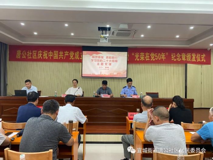 2023年是深入贯彻落实党的二十大精神的开局之年,是实施“十四五”规划承上启下的关键之年。为热烈庆祝中国共产党成立102周年,重温党的光辉历史,弘扬党的光荣传统和优良作风,激励和引导广大党员坚定理想信念、牢记初心使命,全面学习贯彻党的二十大精神。7月1日,唐公社区召开庆祝中国共产党成立102周年党员大会暨“光荣在党50年”纪念章颁发仪式。