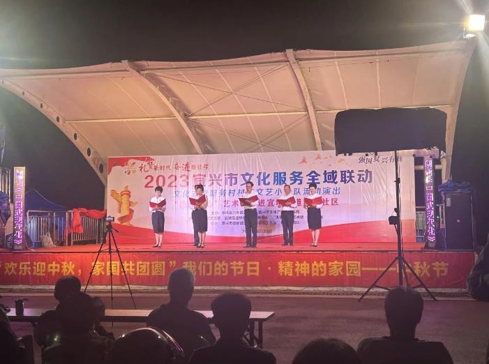 为深入贯彻党的二十大精神,承担起举旗帜、聚民心、育新人、兴文化、展形象的使命任务,担负起新的文化使命、建设中华民族现代文明,深入学习领会习近平总书记关于文化建设的新思想新观点新论断,将其贯彻落实到文化建设全过程各方面。加强基层社区居民幸福指数。9月21日晚,宜城街道民主社区开展“礼赞新时代 奋进新征程—2023年宜兴市文化服务全域联动,文化志愿服务村村行文艺小分队流动演出,氿畔初心艺术团走进宜城街道民主社区活动”。