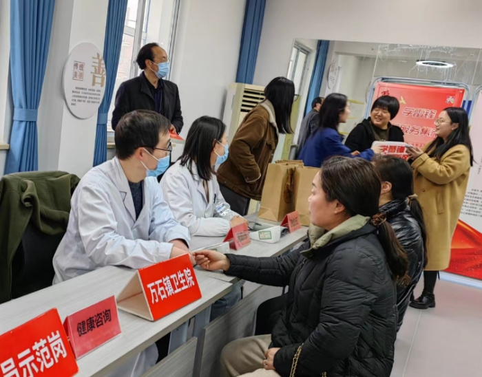 在万石卫生院党员示范岗处,仁心锋骨志愿者团队的医务工作者,正在为居民测量血压,指导居民预防高血压病的发生,开展做好春季流感防治的健康咨询,居民平焕英听了医务人员的讲解表示:“真是获益非浅,不愧是爱心白衣天使!”