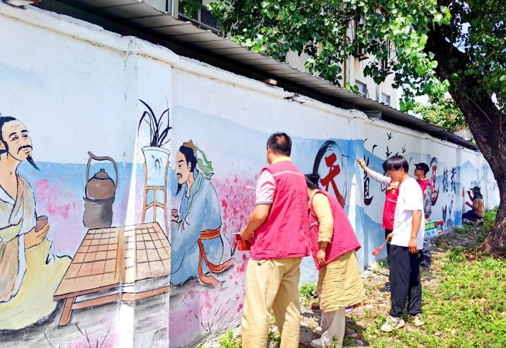 活动前期,汤渡社区特邀墙绘专业老师在陶都中学河对面的墙面上创作了一系列以画里汤渡为主题的墙绘。这些墙绘作品不仅展现了地方特色文化,也让社区居民得到了美的享受。活动现场,陶都中学的学生和志愿者们热情高涨,他们在专业墙绘老师的指导下,增添了“励志青春”、“梦想启航”等正能量标语。这些富有激励意义的言语旨在激发学生们的学习热情和向上精神,营造一个充满艺术气息和积极向上的学习氛围。