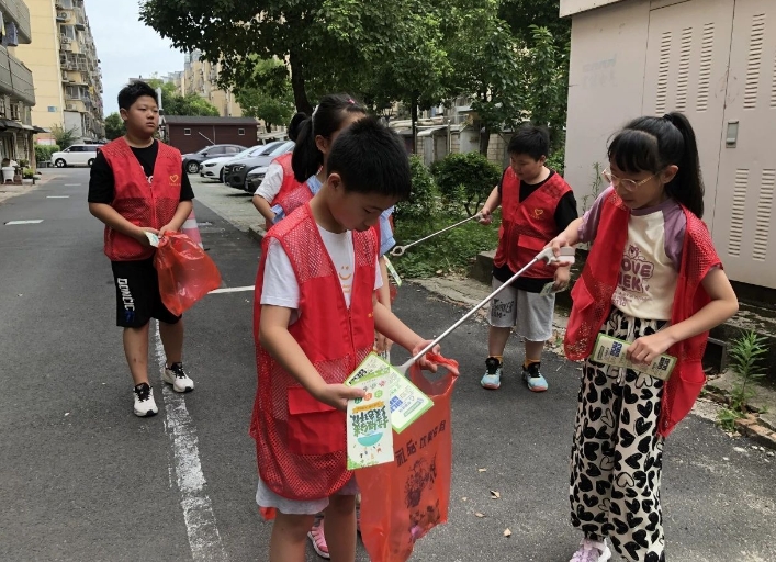 讲座结束后,青少年们身着志愿者服装,在社区工作人员的带领下来到正新嘉苑。孩子们在小区里认真收集垃圾,对公共区域进行彻底的清理。只见他们手持夹子和垃圾袋,专注于清洁每一个角落,确保不留下任何死角。