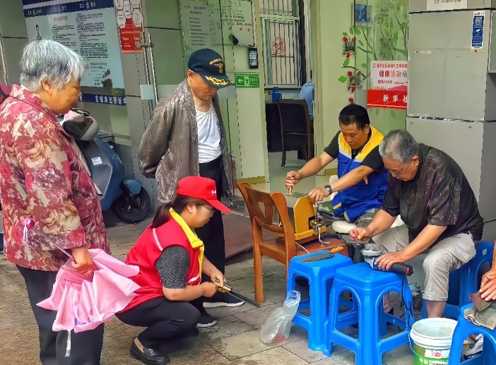 王俊推拿的技师们专注为肩颈僵硬、腰肌劳损的居民进行穴位按摩,手法专业,获居民连连称赞。欢乐公益社的志愿者麻利地磨刀、理发,陶都公益社的师傅快速精准地配制钥匙,解决居民日常需求。
