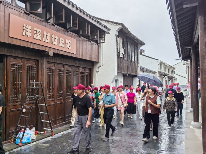 随后,队伍漫步至历史悠久、韵味悠长的洋溪古镇。青石板路、古朴建筑、小桥流水,勾起了老同志们心中深深的乡愁与往昔记忆。他们徜徉于古街老巷,感受着岁月沉淀下的宁静与安然,彼此分享着过去的趣事与人生的感悟,欢声笑语回荡在古镇上空。