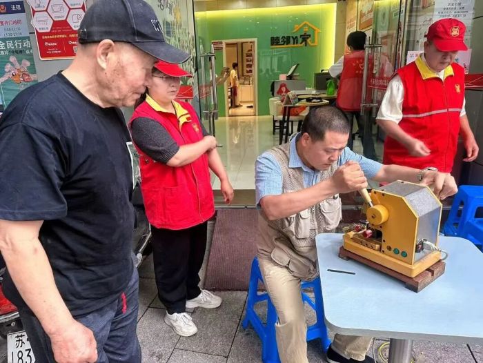 活动现场,各公益团队分工明确、热情满满:欢乐公益社的志愿者手持工具,一边细致打磨刀具,让钝刀重焕锋利,一边耐心为居民修剪发型,剪出清爽形象;陶都公益社专注提供配钥匙服务,精准操作满足居民日常需求;王俊推拿团队则凭借专业手法,为有需要的居民缓解身体酸痛,收获阵阵好评。得知小区内一位90多岁老人腿脚不便,无法到现场参与活动,社区工作人员立刻联动欢乐公益社志愿者,主动上门提供理发服务。志愿者轻声询问老人需求,小心翼翼梳理、修剪,全程细致又贴心,理完发后,老人笑着连连道谢。