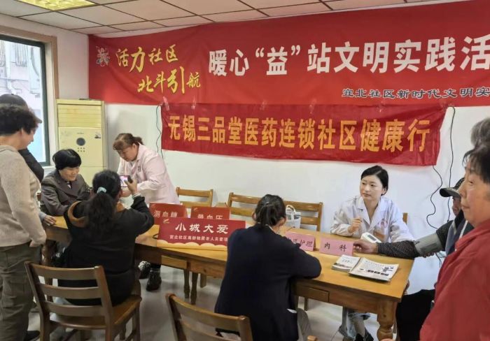 活动现场,大家有序排队,来自三品堂的志愿者们为居民提供免费量血压、测血糖服务。志愿者一边操作,一边耐心询问居民的日常健康状况,提醒大家关注血压血糖变化,对数值异常的居民及时给出健康建议。另一边,红塔医院的志愿者带来了“糖尿病防控”专题指导。志愿者们用通俗易懂的语言,向居民讲解糖尿病该如何科学用药,强调遵医嘱服药的重要性,同时结合季节特点给出饮食建议,比如多吃杂粮、控制糖分摄入等,现场居民认真聆听,不时点头回应。中医区更是排起了小长队,志愿者为有需要的居民进行耳穴埋籽,通过刺激耳部穴位帮助调理身体。