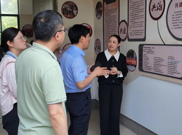 领导一行来到新华社区紫金名都睦邻点,首先映入眼帘的是一派干净整洁、文明有序的小区整体面貌。社区和物业公司、小区业委会三位一体,齐头并进,发挥合力,共同为构建文明和谐小区贡献力量。通过实地参观、听取介绍和现场交流等方式,认真了解了小区红色物业建立、发展和小区架空层的建设布置。小区幸福家园、文明晾晒处、居民活动室等无不展现出红色物业引导居民自治、发挥党员先锋带头作用的成果,给领导一行留下深刻的印象。在工作人员的介绍下,领导们又深入了解了社区的三大品牌项目:睦邻点、共建之花、暖心微+、睦邻一家。