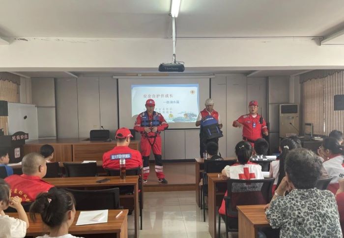最后,还指导青少年进行了现场救援模拟演练,教授大家如何穿戴使用简易的救生衣,增强自救能力。