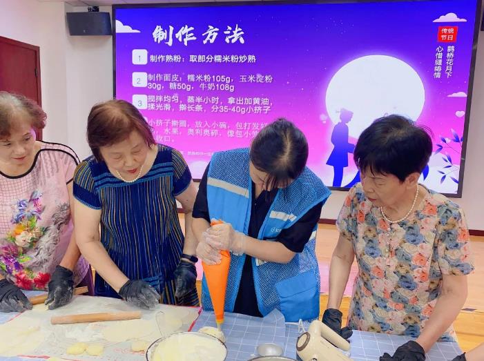 活动期间,在社区工作人员的引导下,大家成双成对围成一圈,男士先炒熟面粉、擀烙面皮,女士则打发奶油、收口包心,最后一起点缀冷藏,经过半个多小时的携手创作,一个个白白嫩嫩、小巧精致的雪媚娘很快就新鲜出炉。