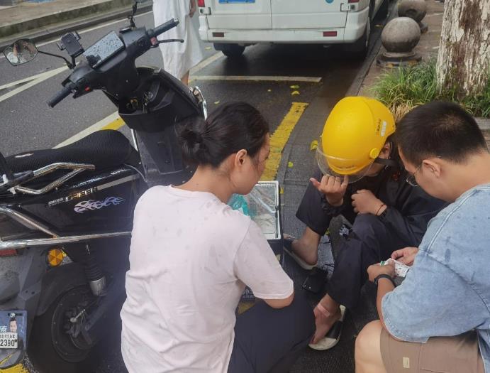 近日,连续阴雨天气,道路湿滑,容易发生意外。大雨天气,新华社区社工偶遇一名外卖员在送餐途中因雨天路滑导致摔车。