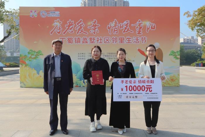 “赠人玫瑰,手有余香”,爱心居民贺洪梅牵手女儿捐赠一万元,用于社区敬老服务。丁蜀镇老年协会会长吴建忠、蠡墅社区党总支书记汤雪姣为爱心人士授牌、颁发证书。