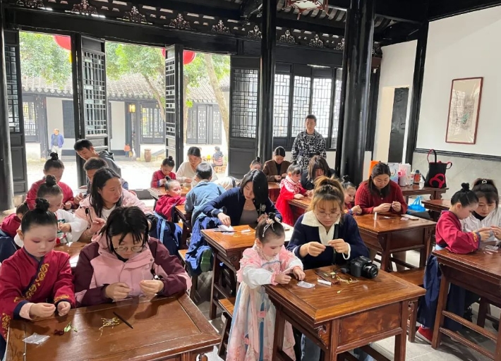 紧接着,子衿阁汉服体验馆的老师向亲子家庭讲述了发簪的典故、样式等。随后老师细致耐心地介绍发簪的制作过程并指导大家如何制作。从凌乱的素材到精美的发簪,亲子间的默契和相互鼓励,成就了一件件美丽的艺术品。“发簪真的太好看了,想送给我的亲爱妈妈。”每一件作品都记录了他们的成长,每一刻的笑声都洋溢着无尽的快乐。