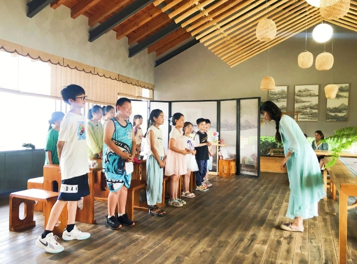 夏日,阳光透过叶隙,洒在莲池的碧波上,水面泛起一圈圈涟漪。庐舍藏于繁茂之中,窗外,荷叶田田,绿影婆娑。午后,莲花荡茶舍,雅室静隅,茶香氤氲。一袭青衣素杉的周梦丽老师浅笑轻语,茶叶的种类、泡茶的技巧、坐立的姿态、饮茶的礼节……